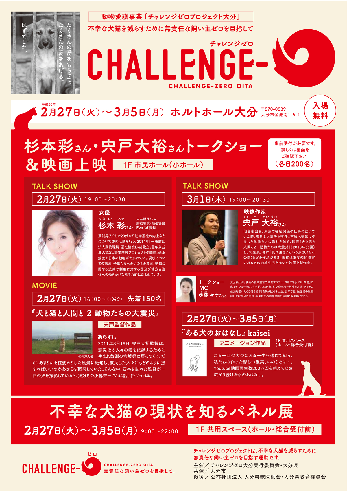 2018年2月27~3月5日にホルトホール大分にて行われたチャレンジゼロ大分 トークショーにてMCとして参加いたしました。ゲストに、公益財団法人動物環境・福祉協会Evaの代表である杉本 彩さん、『犬と猫と人間と2 動物たちの大震災』等のドキュメント映像作家・宍戸 大裕さんをお迎えして、犬猫殺処分の現状、動物虐待やペット販売等、動物たちを巡るさまざまな問題についてトークセッションをいたしました。そして、宍戸監督の映画『犬と猫と人間と2』の上映、今なおSNS等で広がり続ける『ある犬のおはなし』(作・絵 kaisei)のショートムービーを映像と共に後藤やすこが朗読しました。さまざまな視点から、人間の生み出しているいのちの問題を問いかけました。