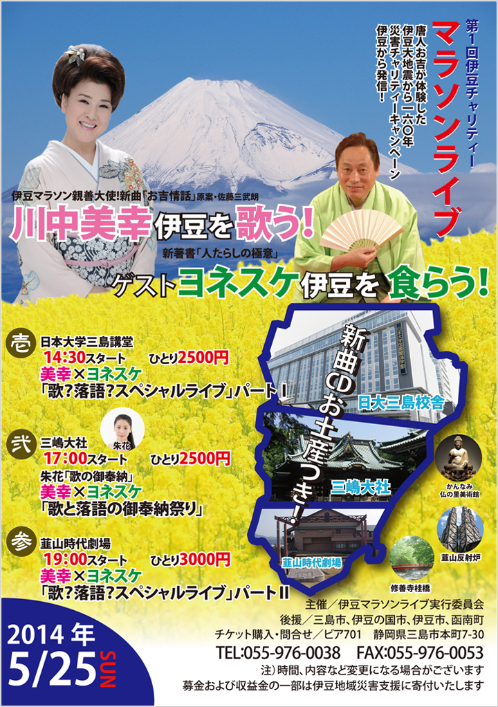 伊豆市内・全三カ所にて開催される、川中美幸さん・ヨネスケさん出演の『第1回伊豆チャリティーマラソンライブ』の2ヶ所目・三嶋大社にて朱花が歌をご奉納させていただきます。