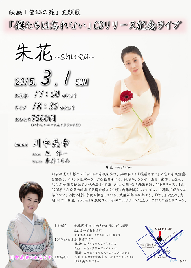 2014年12月公開の映画『望郷の鐘』(主演:内藤剛志)の音楽を後藤やすこが担当します。そして主題歌には朱花の歌う「僕たちは忘れない」が決定しました。『残留孤児の父』と言われた山本慈昭。民間人でありながら、生涯を残留孤児たちの肉親探しにささげ、献身的な愛でささえた。その生涯を描いた、感動の劇映画です。